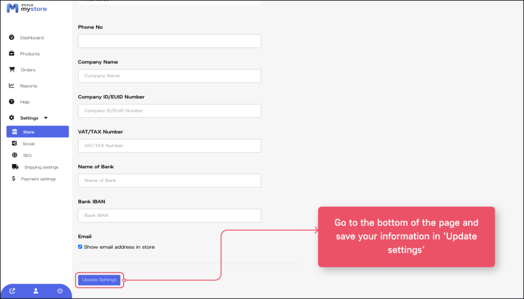 3. After filling in your store information, just go to the bottom of the page and save your changes by clicking on ‘Update settings’. Done, your store settings are now updated!