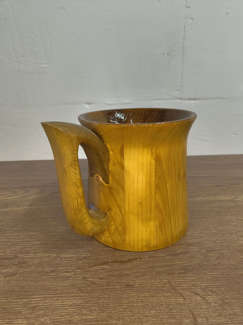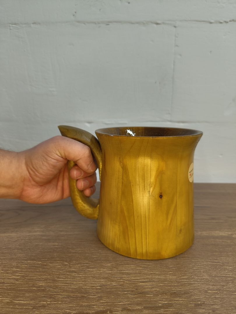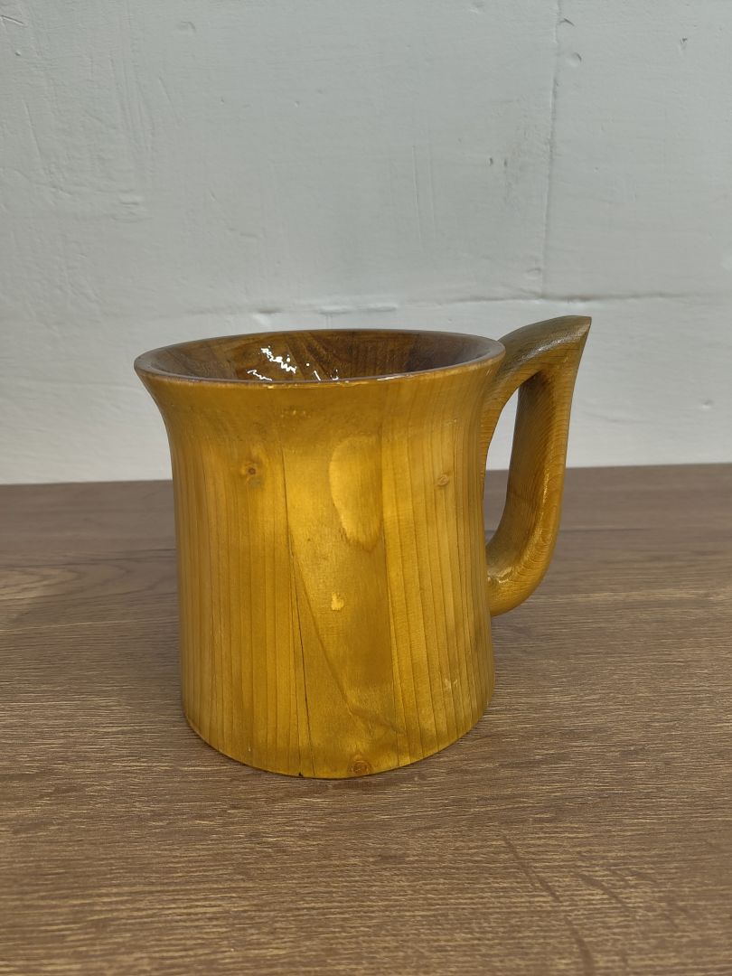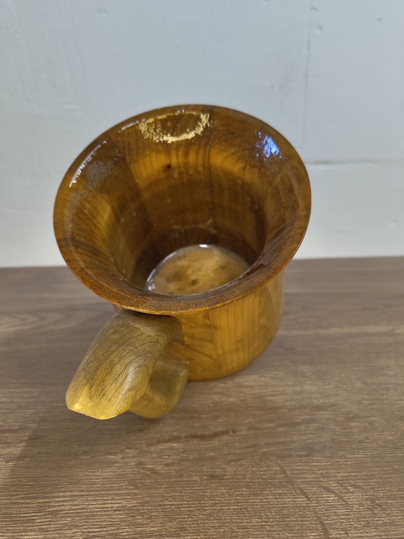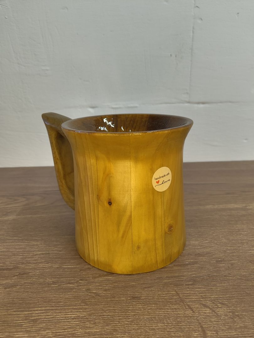 Dieser 0,5 Liter Becher ist ein wunderschönes und nachhaltiges Trinkgefäß, das aus recyceltem Palettenholz gefertigt wurde. Dieser formschöne Bechers besticht durch seine Schlichtheit und Formschönen Griff. Innen ist der Becher mit einem alkoholbeständigen Kunstharzlack lackiert, der nicht nur für eine ansprechend natürliche Optik sorgt, sondern auch die Langlebigkeit und Funktionalität des Bechers gewährleistet.