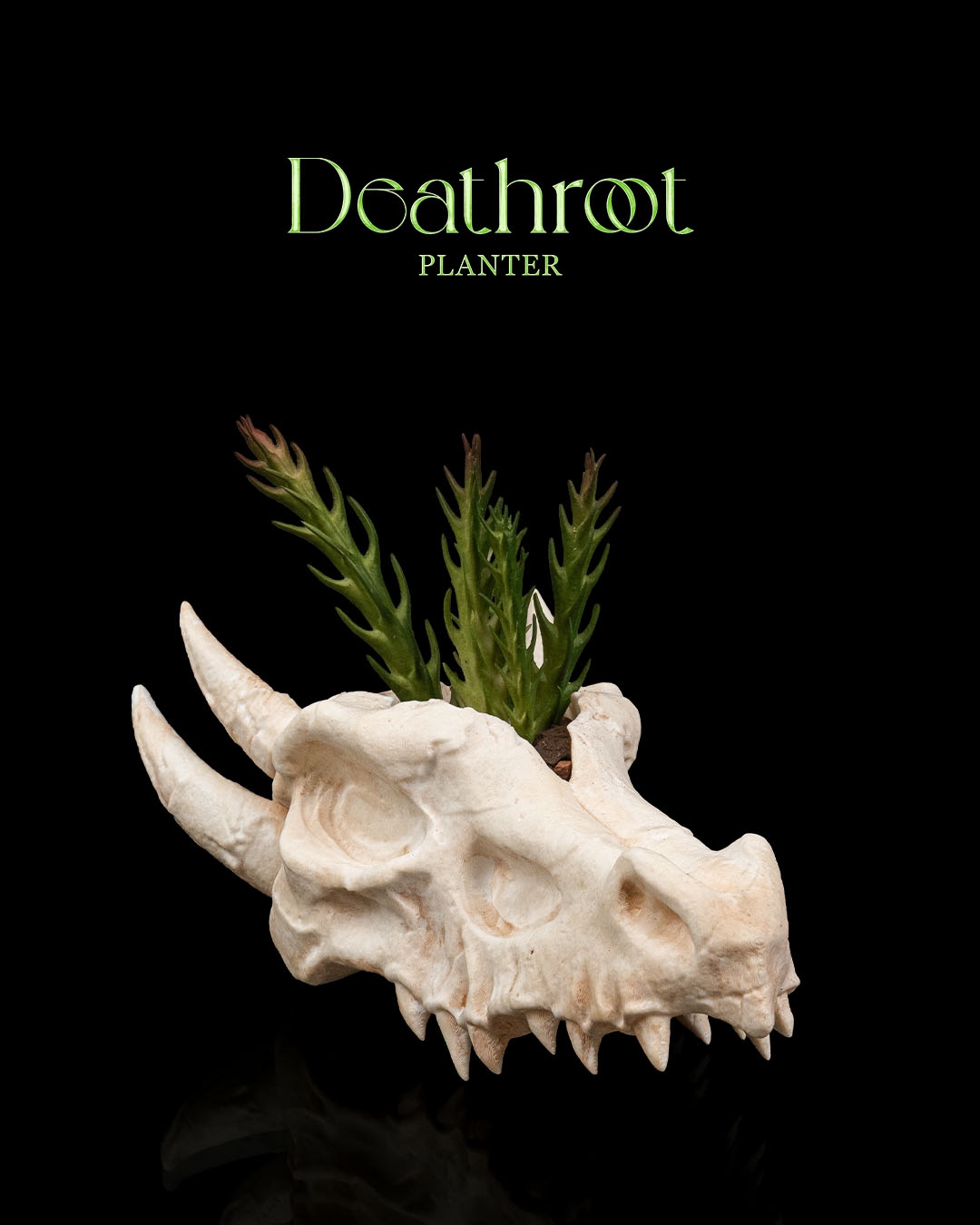 A small planter in the shape of a dragons skull, printed and given a light paintjob for more realistic affect. This Planter sits around 6 inches in length