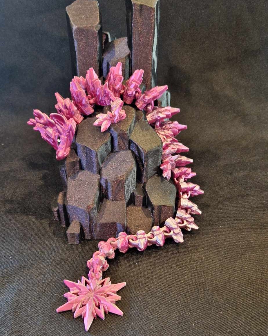 Ce modèle est imprimé avec un filament brillant rose et argenté. Le dragon adulte fait entre 36 et 42 cm de long en fonction du modèle.