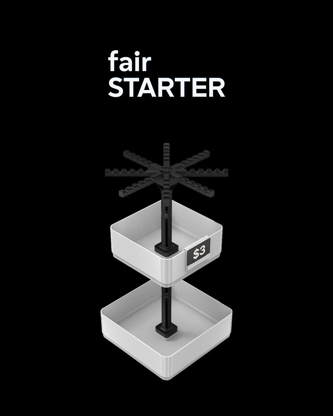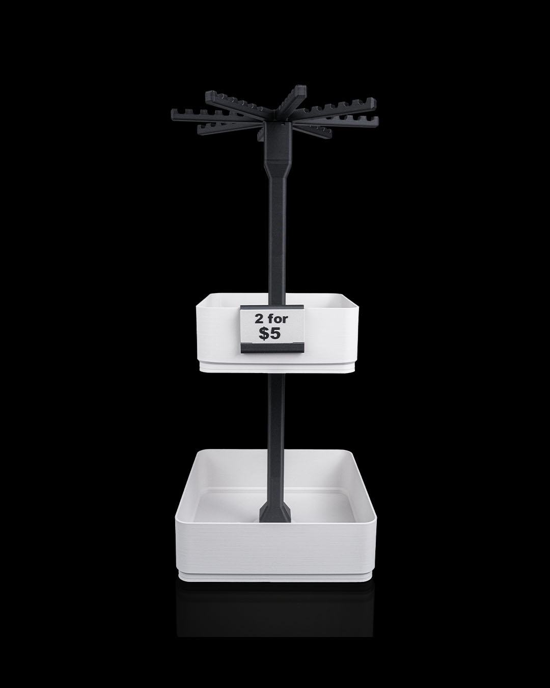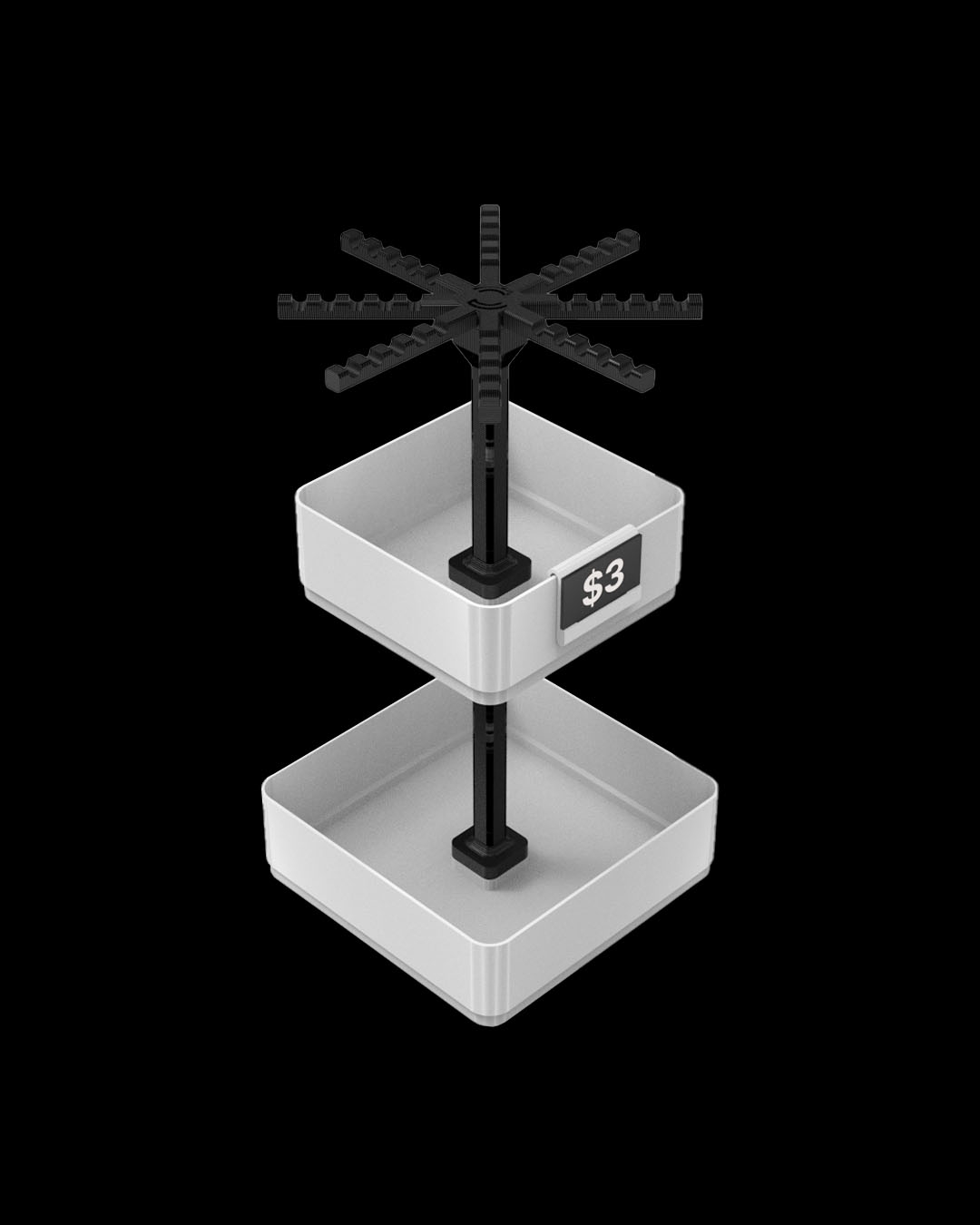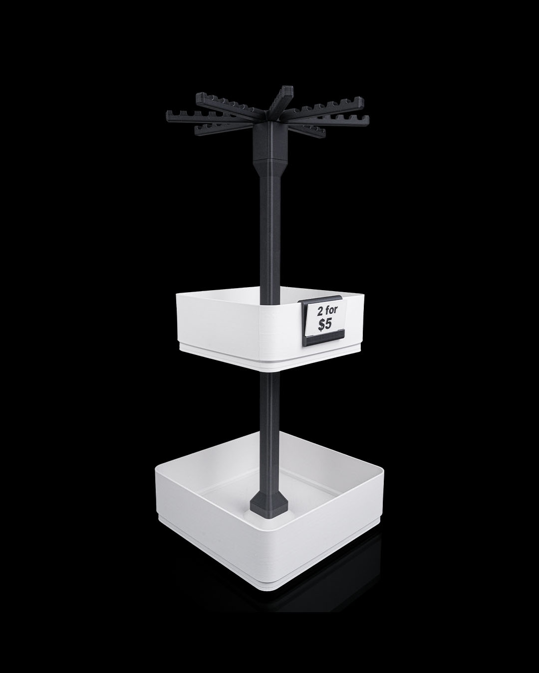 Inclui uma tela giratória de chaveiro, além de uma bandeja grande e uma de média, perfeita para misturar itens pendurados com pequenos produtos em exibição. Um ótimo ponto de entrada para feiras, barracas e mesas compactas.