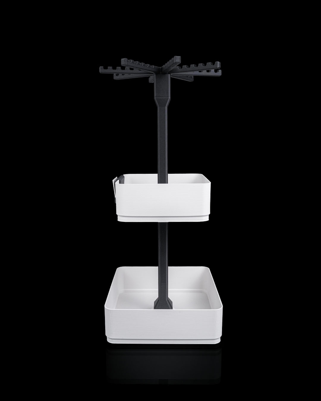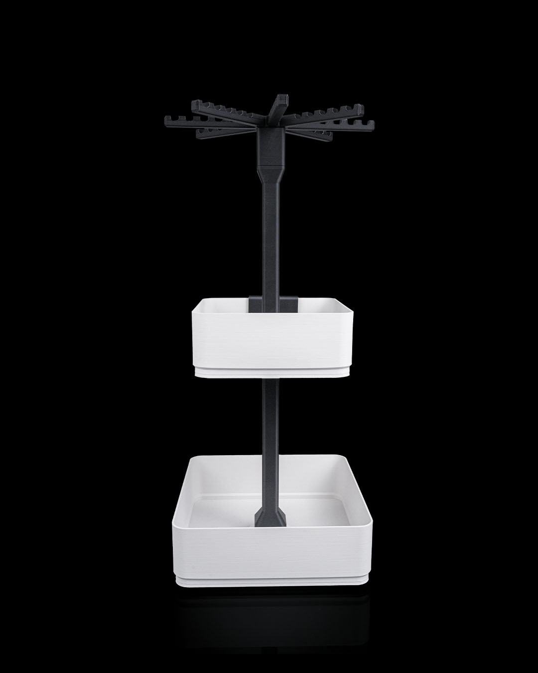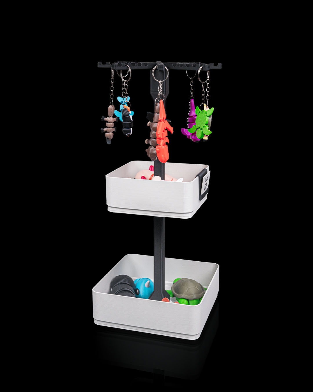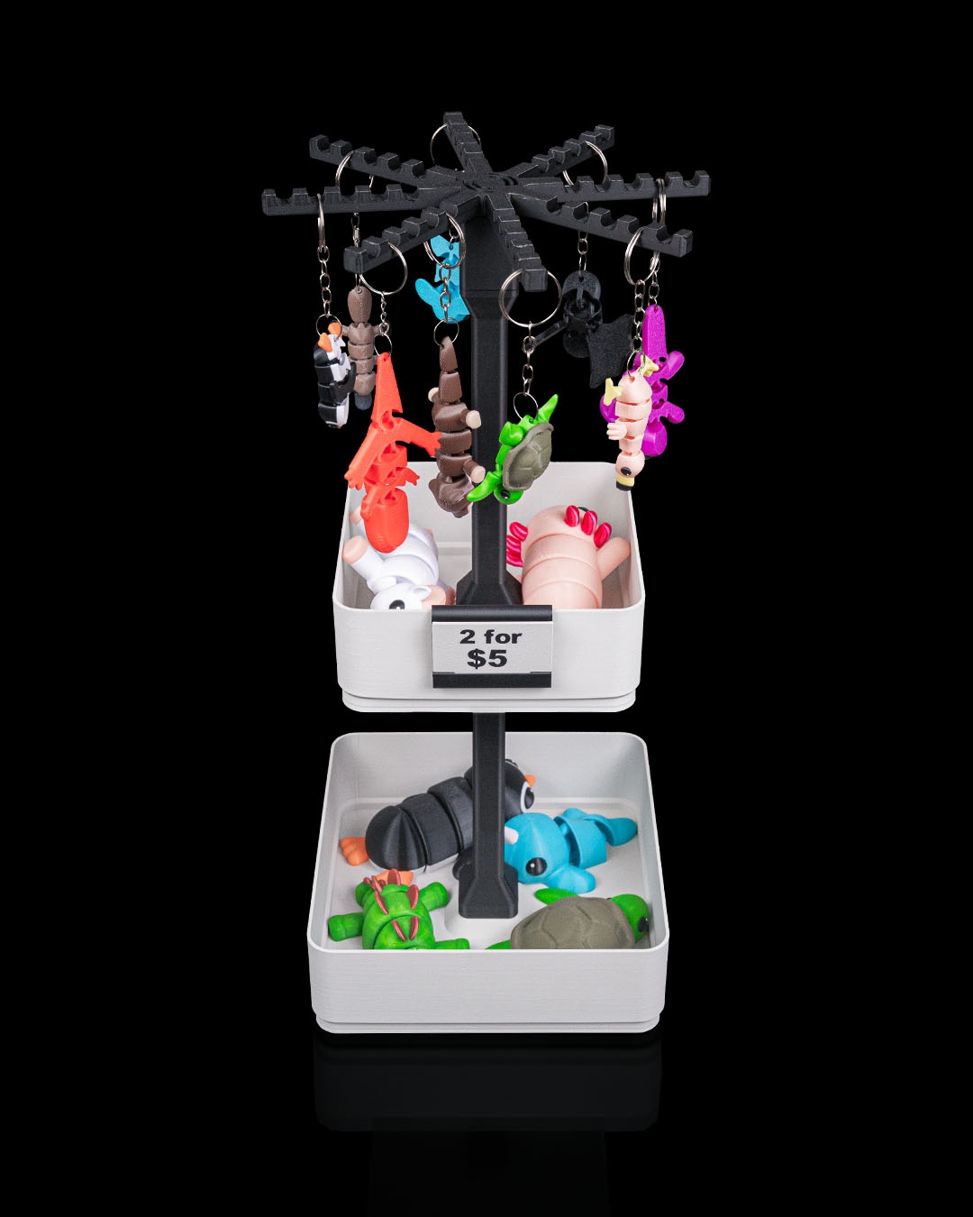 Inclui uma tela giratória de chaveiro, além de uma bandeja grande e uma de média, perfeita para misturar itens pendurados com pequenos produtos em exibição. Um ótimo ponto de entrada para feiras, barracas e mesas compactas.