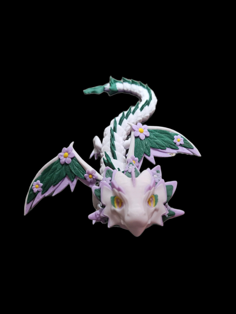 Bring a touch of magic and nature to your collection with the 3D Printed Flower Dragon, a beautifully crafted creature blooming in shades of white, green, and purple. Inspired by the delicate beauty of springtime blossoms and mythical legends, this dragon features a fully articulated body, allowing for graceful, flowing poses.