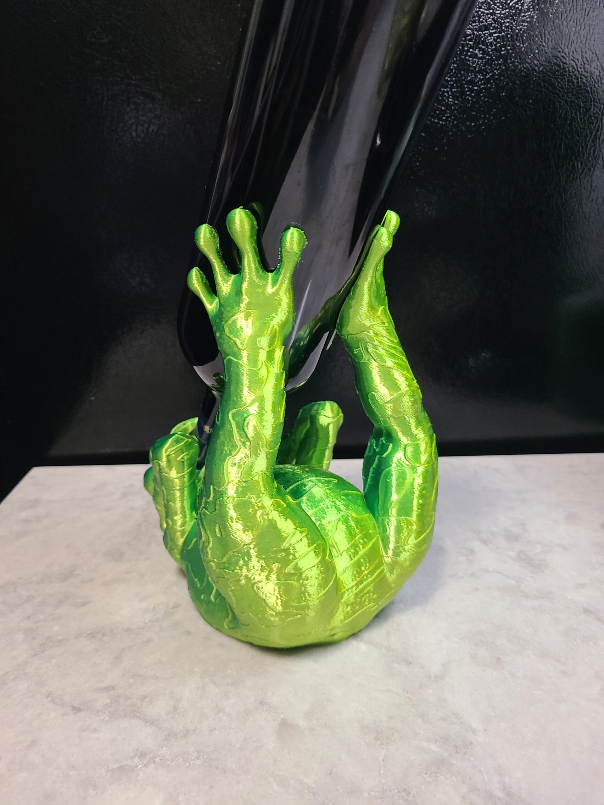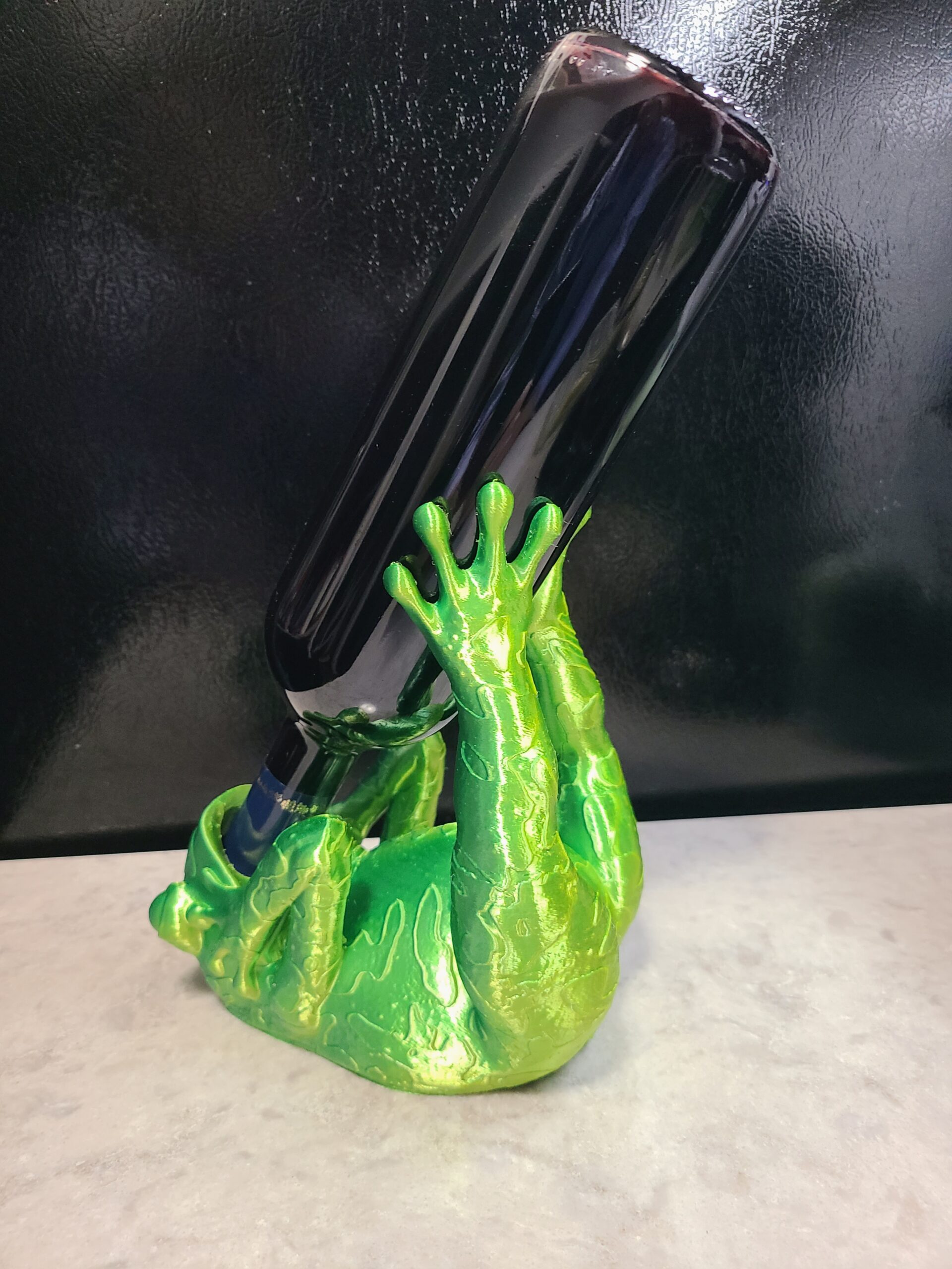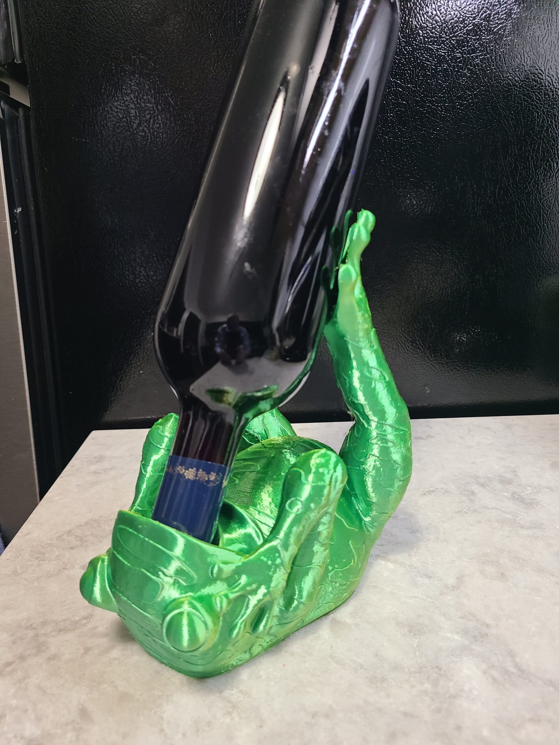 Let Mr. Frog hold onto your wine for you. By the way, he only took a sip. Makes a nice centerpiece for your next dinner party. Made from bi-extruded green and yellow silk PLA. Changes colors as you rotate it.