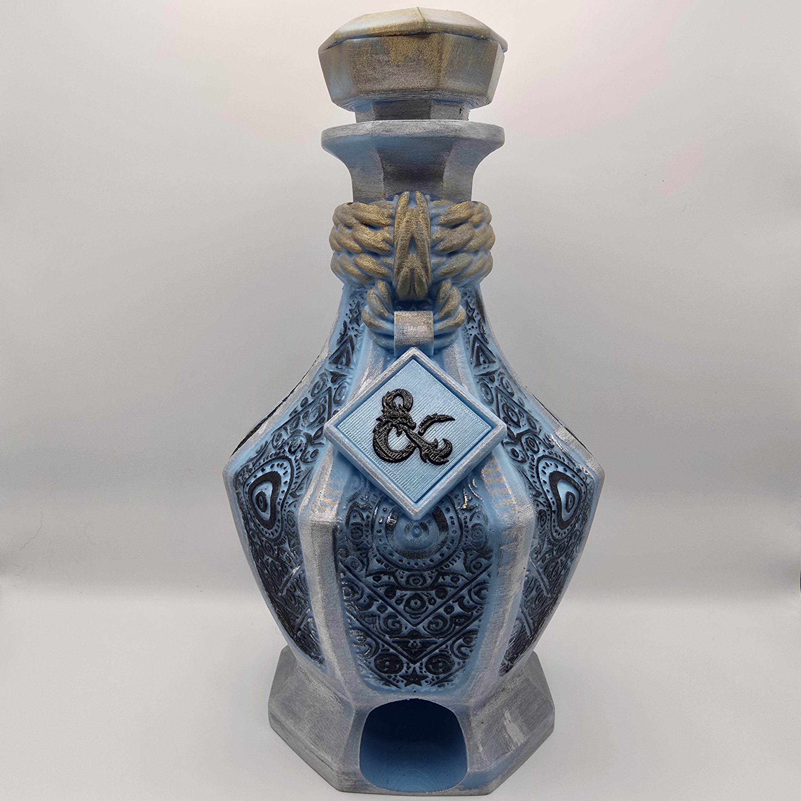 Potion bottle dice tower and dice storage by Little Tup.  Rotate cap fully clockwise and the bottle becomes a dice tower, rotate it fully counterclockwise and you have a storage bottle! This one glows in the dark. Dry brush painted to make details stand out.
