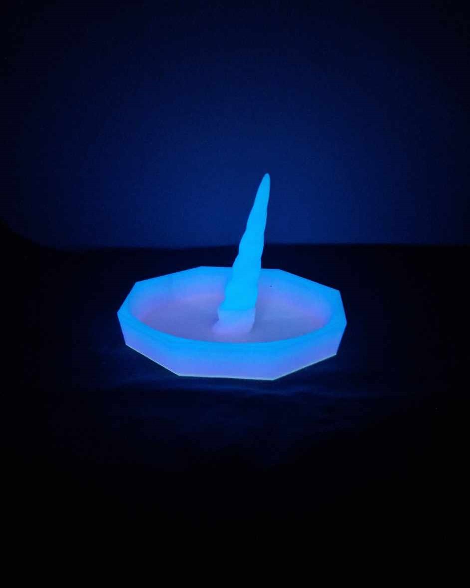 Ce modèle phosphorescent rose et violet deviendra bleuté dans le noir.