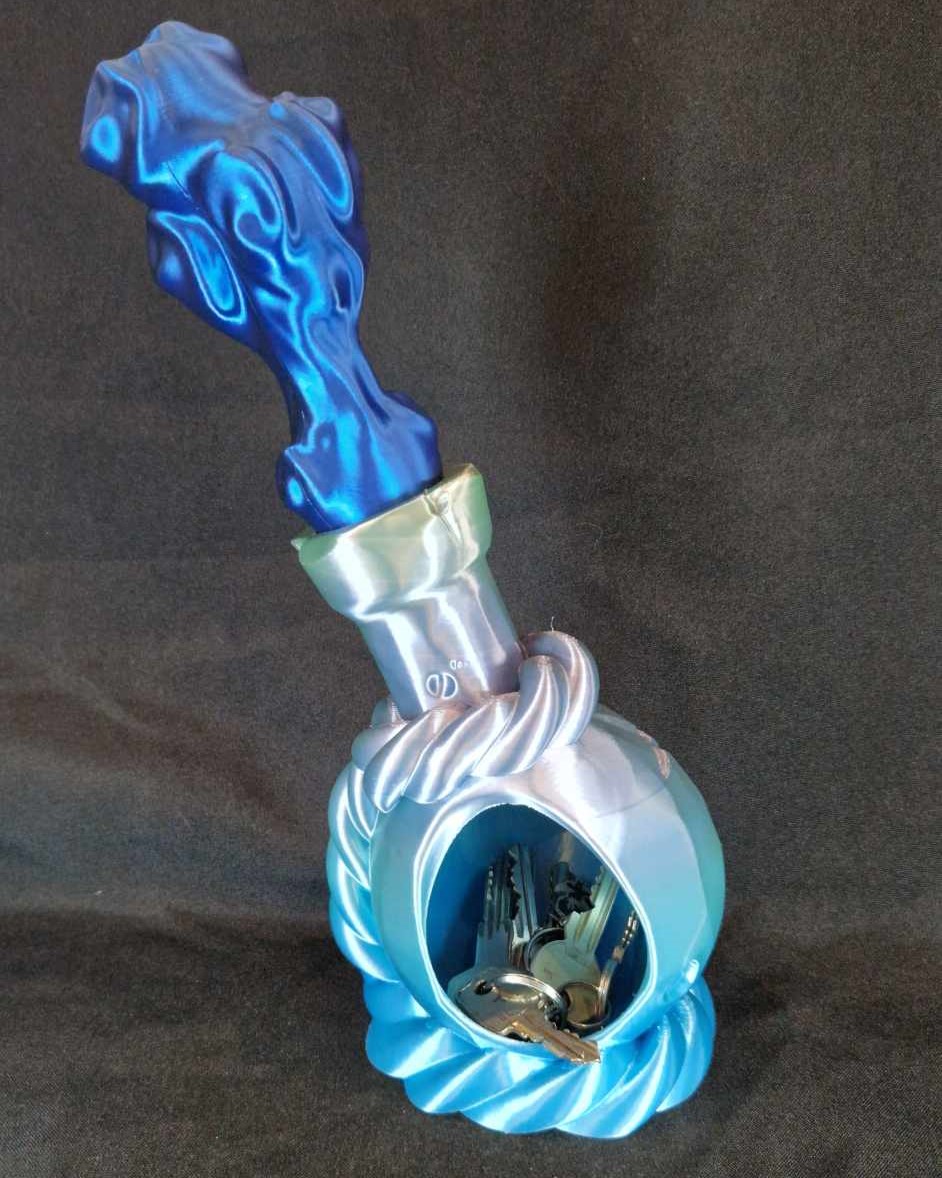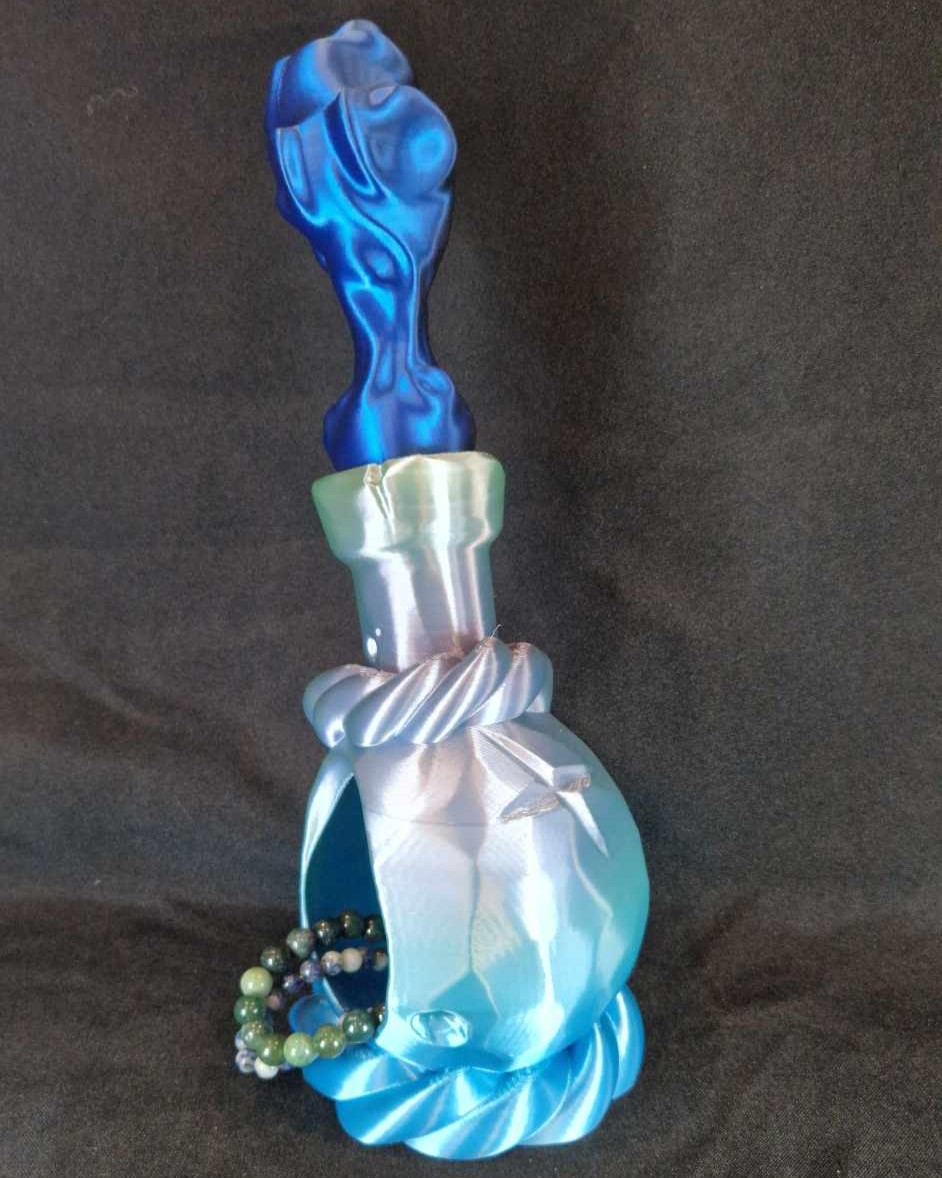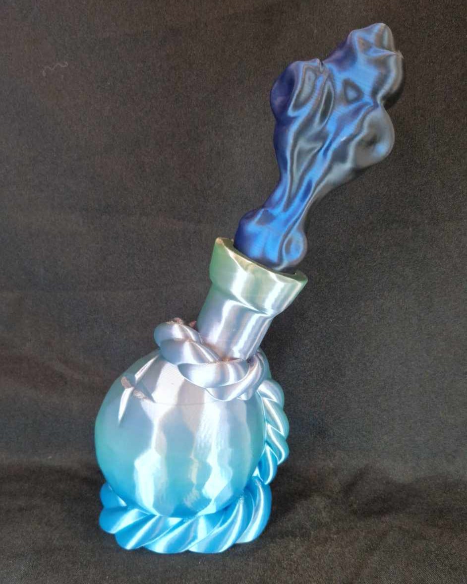 Ce modèle est imprimé avec un filament avec un dégradé de bleu pour la potion, la fumée est imprimée avec un filament bicolore bleu et noir.