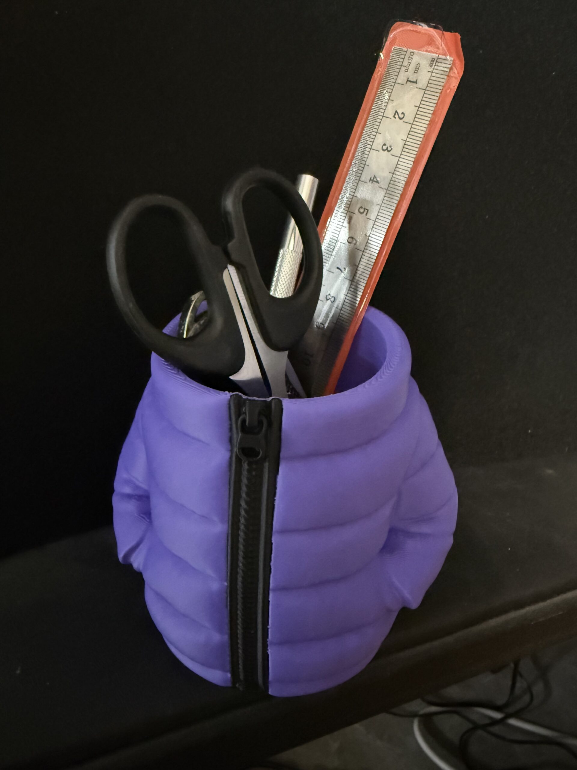 Desktop pen/pencil holder shaped like a puffer jacket. Also available as a can koozie in a larger size. Can also do color requests for different colors of jackets.