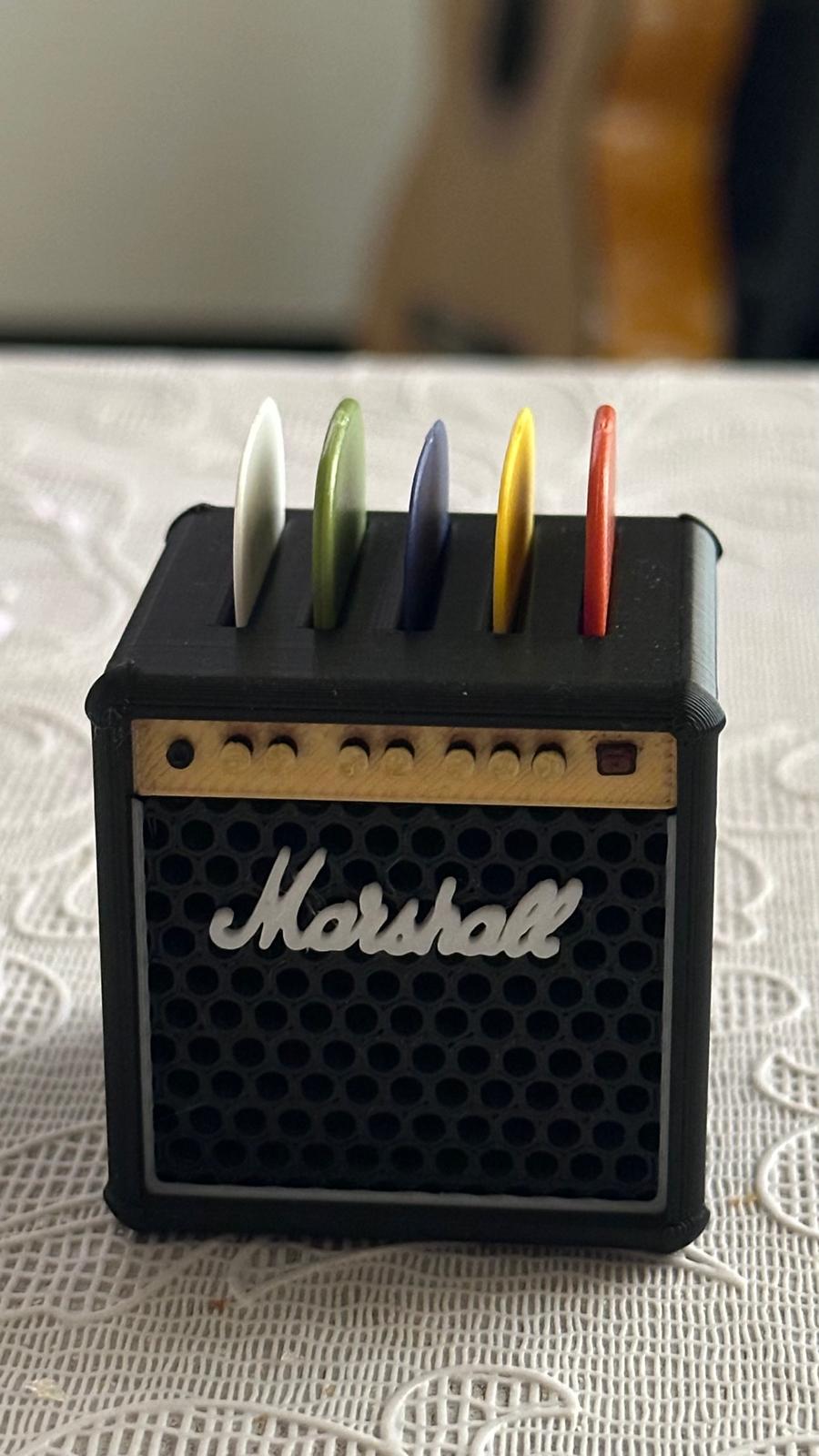 se hace altavoz replica de Marshall para guardar las púas de tu guitarra, sirve para guardar 5 púas.