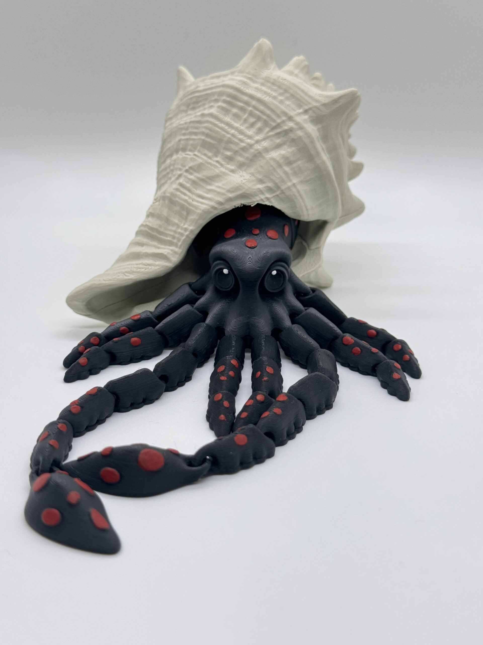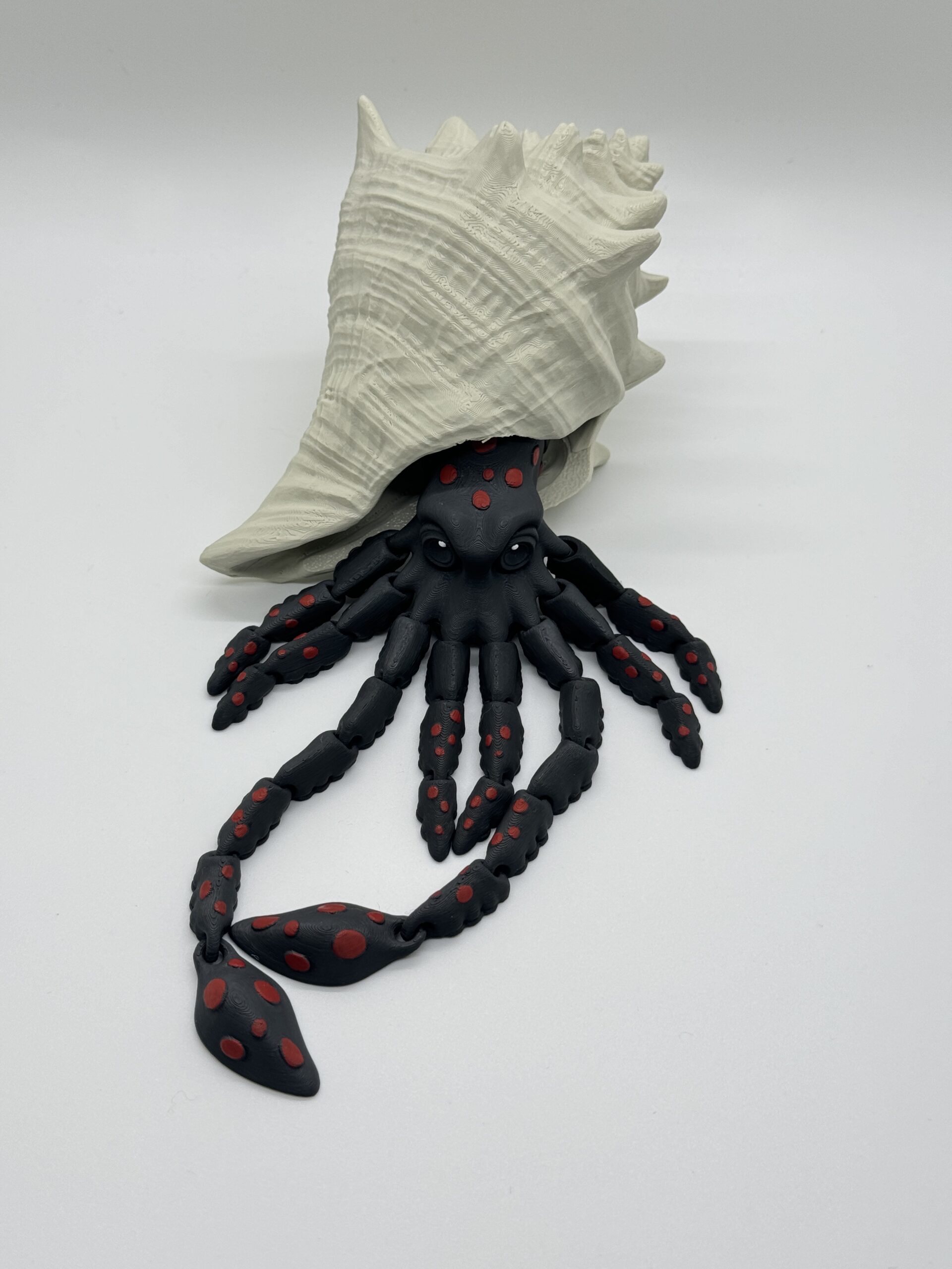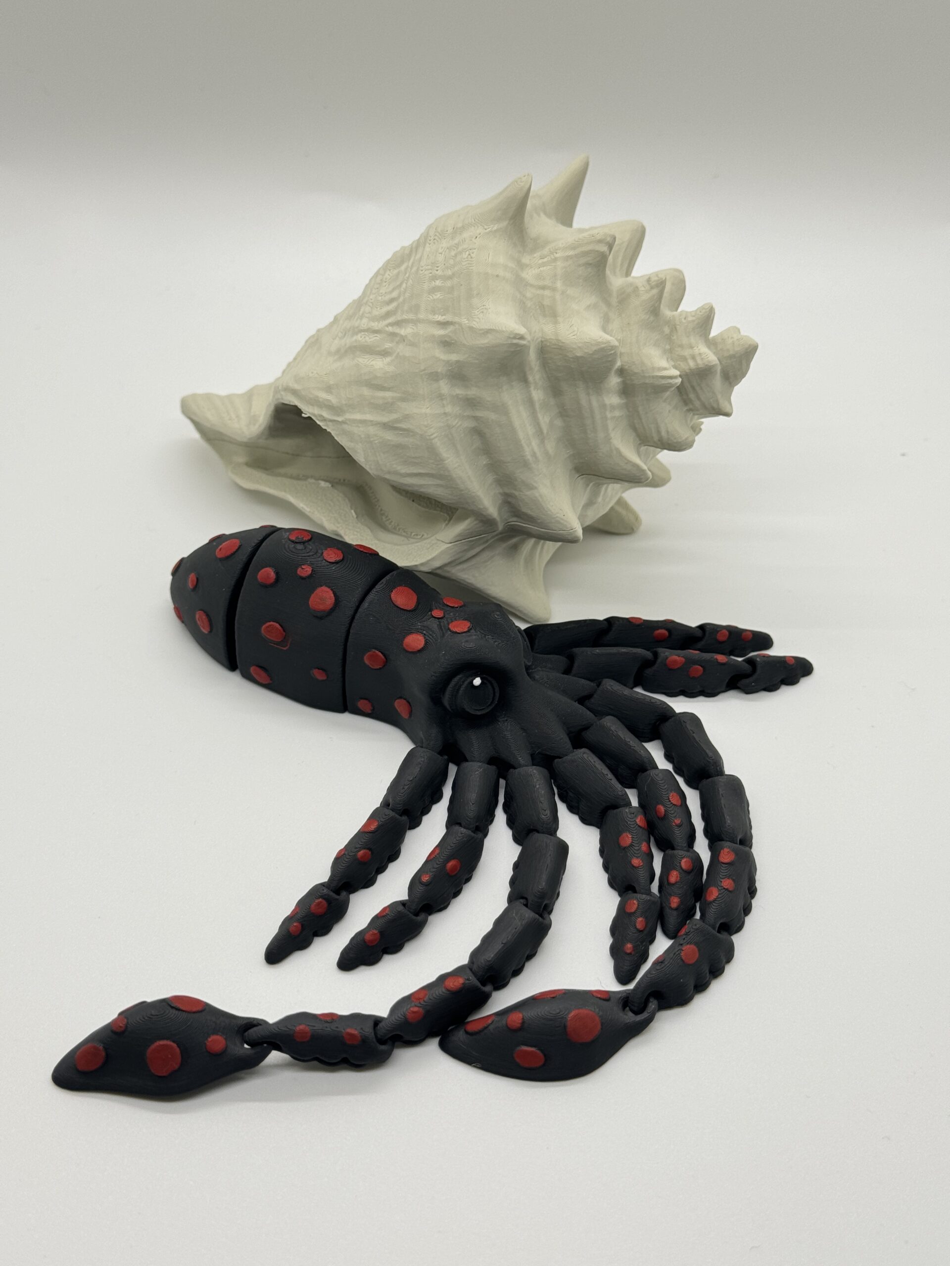 Looking for something less dragon-like and still pretty sweet? Meet Sky, the Squid. Made with black PLA and hand painted red spots, with a customizable white shell you can paint, or leave natural