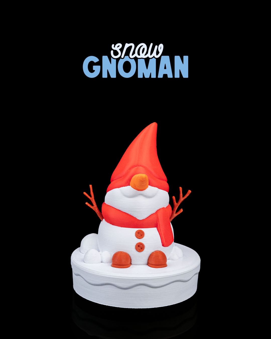 No centro, há uma estatueta que é uma fusão de um gnomo e um boneco de neve. A figura tem um corpo branco de boneco de neve, usa um chapéu pontudo vermelho típico de gnomo, um cachecol vermelho, um nariz laranja semelhante a uma cenoura e braços de graveto. Pequenos pés laranjas são visíveis na parte inferior.