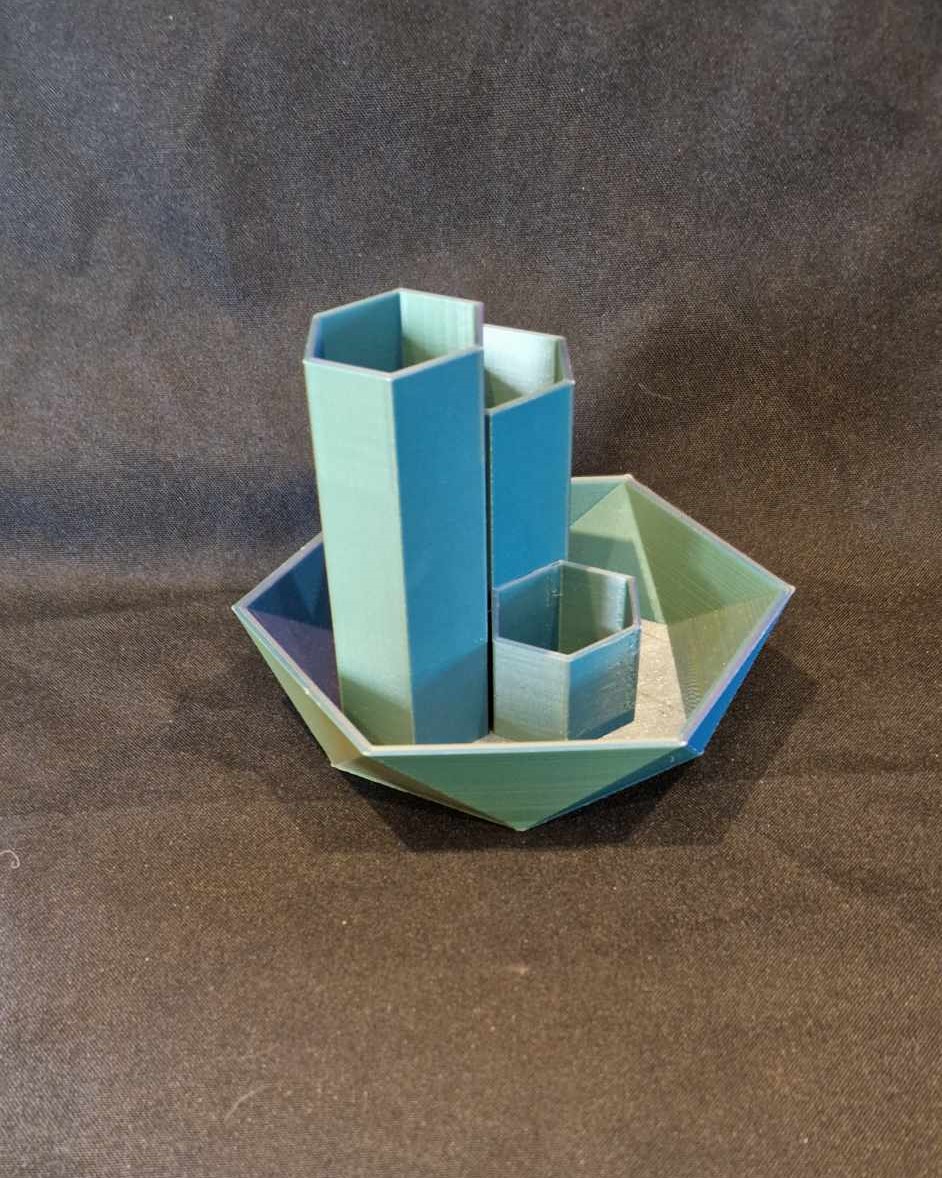 Organisez votre bureau ou votre salle de bain avec cet organisateur composé de trois hexagones intégrés dans une soucoupe ! Ce design astucieux permet de ranger vos accessoires, fournitures ou essentiels sans les mélanger, tout en gardant tout à portée de main. La soucoupe ajoute une touche d’élégance et de fonctionnalité, empêchant les petits objets de se perdre.