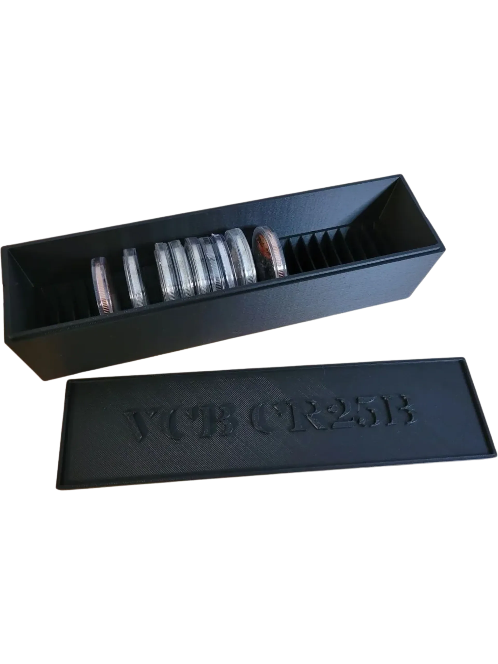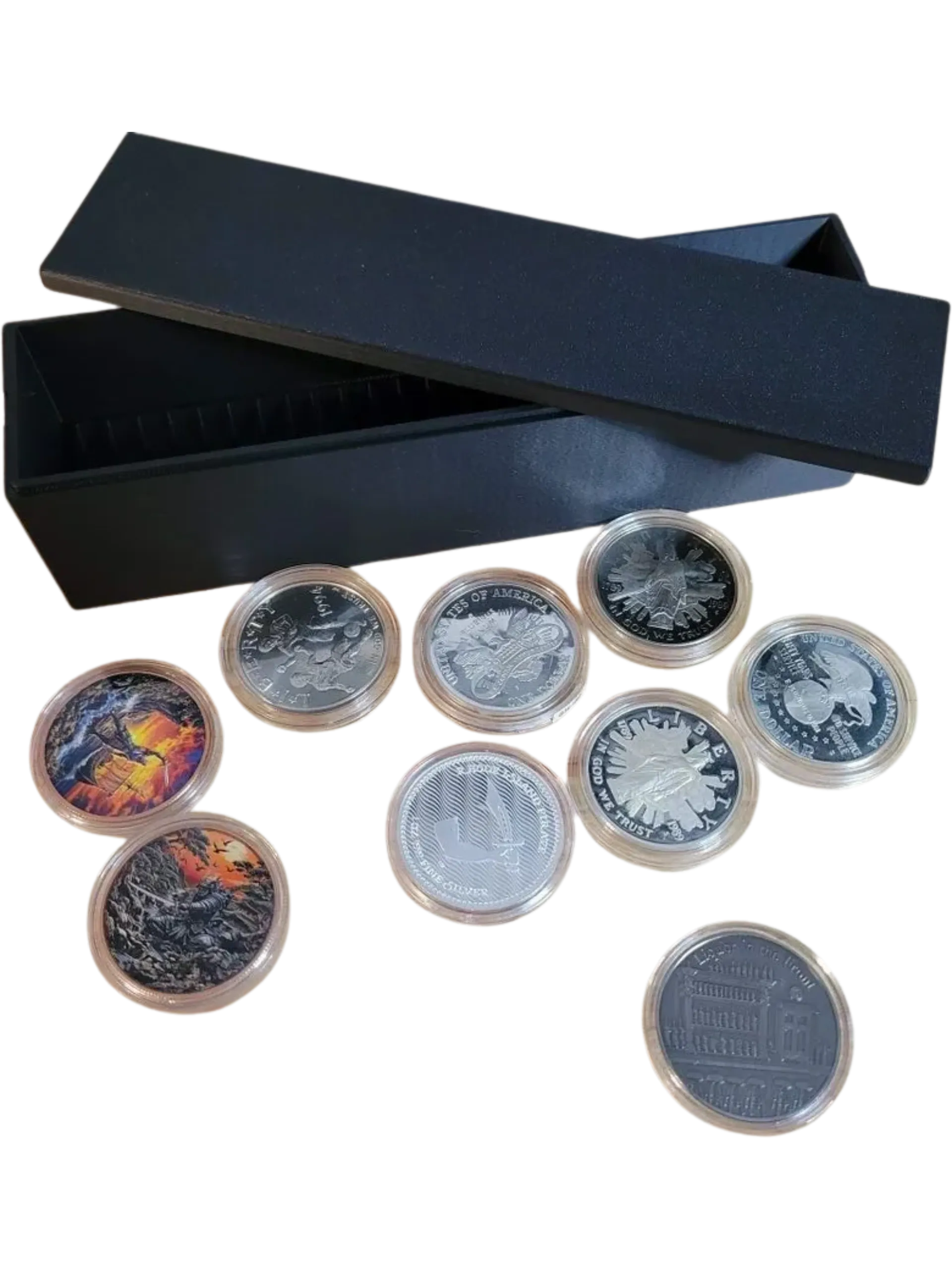 Designed to hold up to 25 standard round coin capsules (American Silver Eagle, Canadian Maples, Mexican Libertads, and similarly sized coins). Available in several colors. (Currently Black, Blue, Red, White, Green, Matte Black).