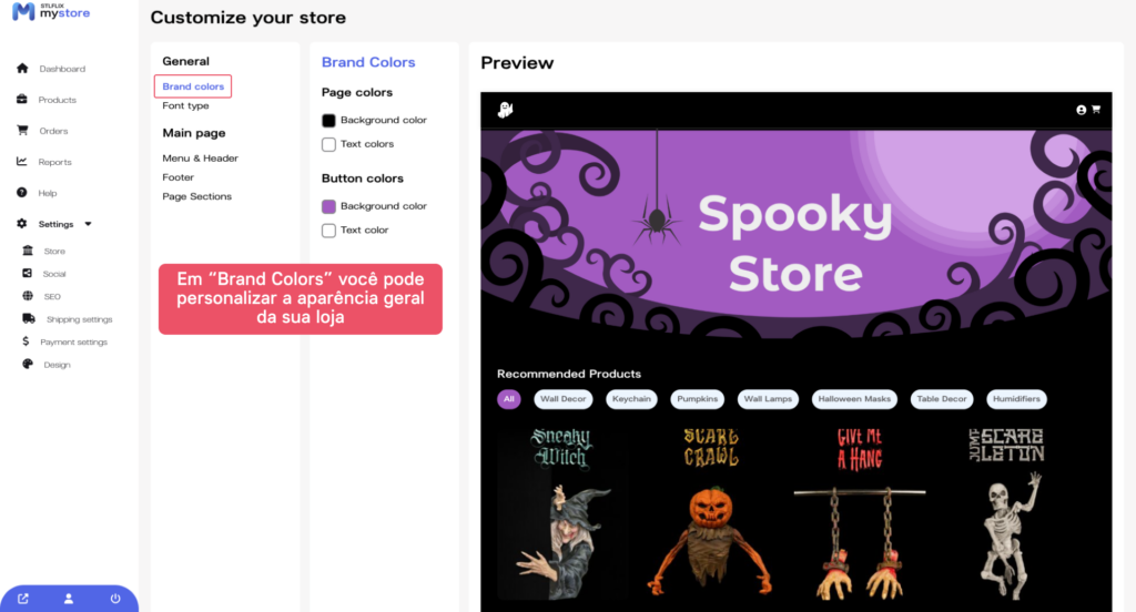 Na seção “Geral”, você pode escolher as cores da marca da sua loja. Clique na aba “Cores da marca” e selecione as cores que representam sua marca. Você também pode carregar suas próprias cores personalizadas.