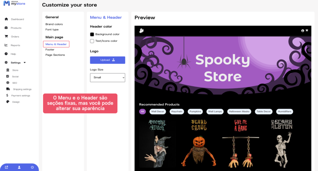 Agora que você selecionou as cores da marca e o tipo de fonte da sua loja, você pode personalizar o menu e o cabeçalho da sua loja. Clique na aba “Menu e Cabeçalho” e ajuste as configurações conforme sua preferência.