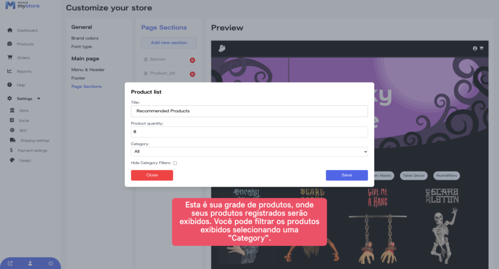 Agora que você personalizou o menu, o cabeçalho e o rodapé da sua loja, você pode adicionar seções de página. Clique na aba “Seções de Página” e selecione as seções que você quer adicionar.