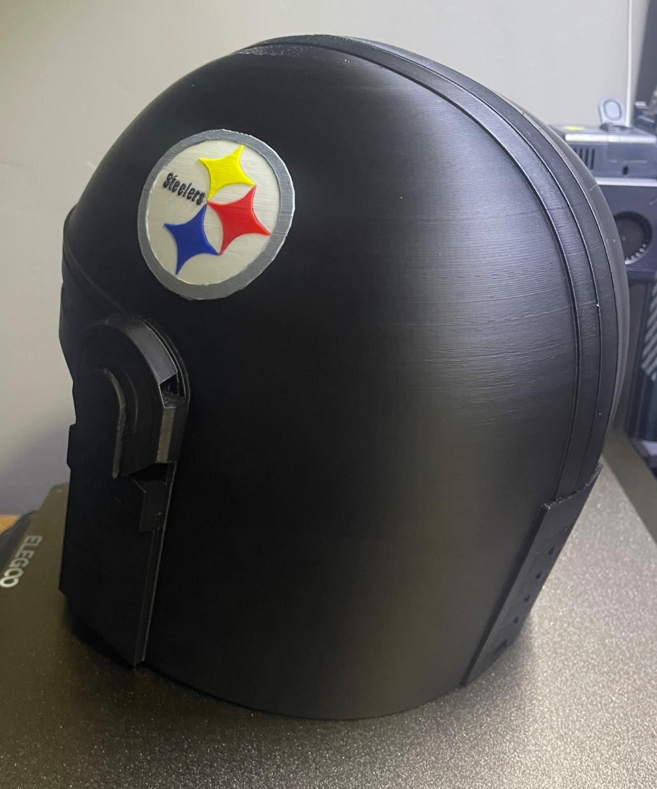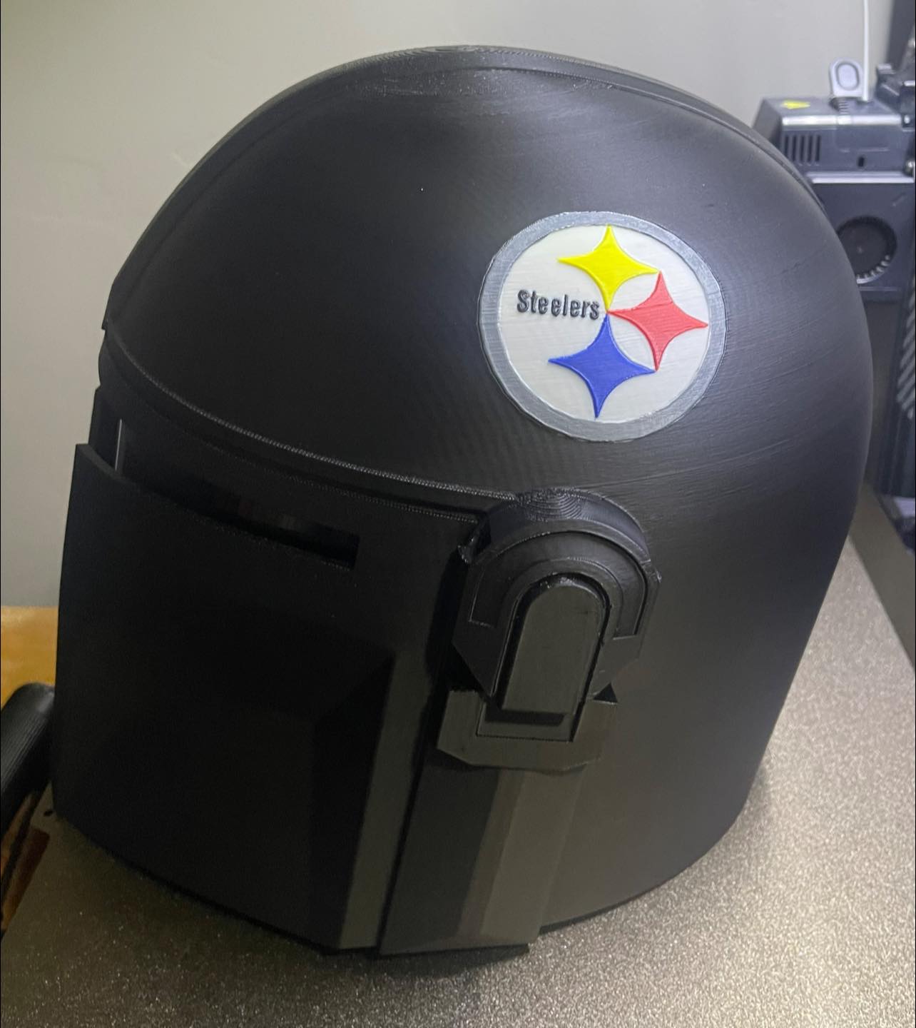 3D printed Mandalorian helmet with a circle and stars on both sides. This helmet is sized approximately the same as a medium to large motorcycle helmet. It includes a tinted visor.