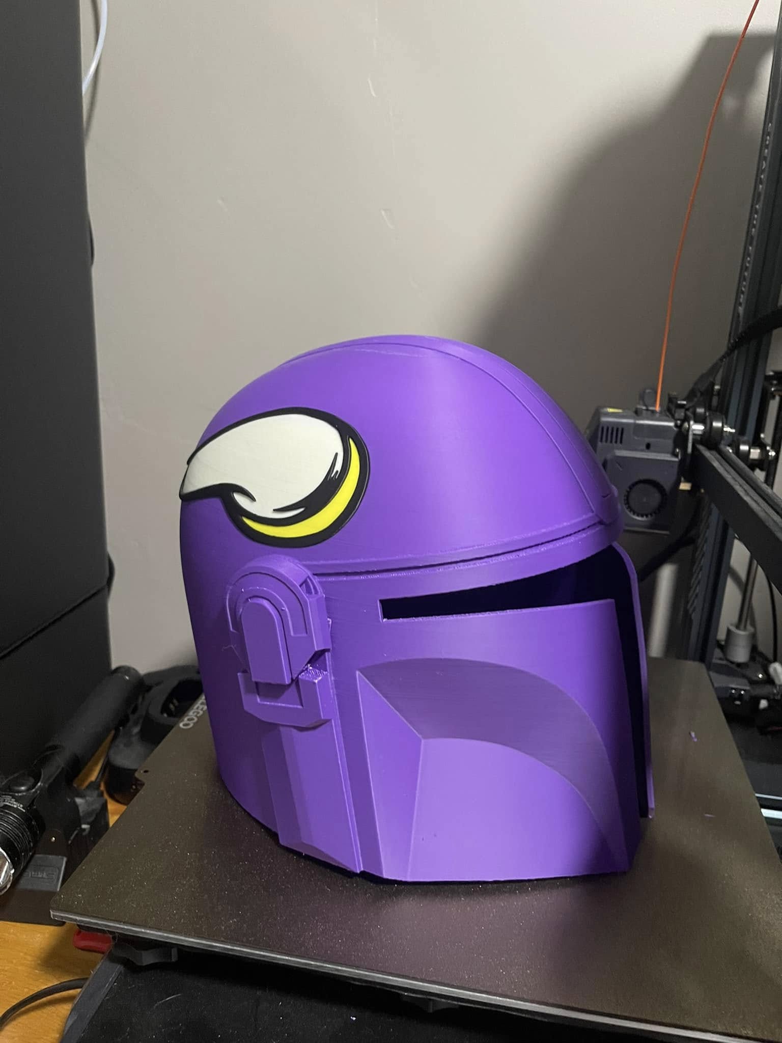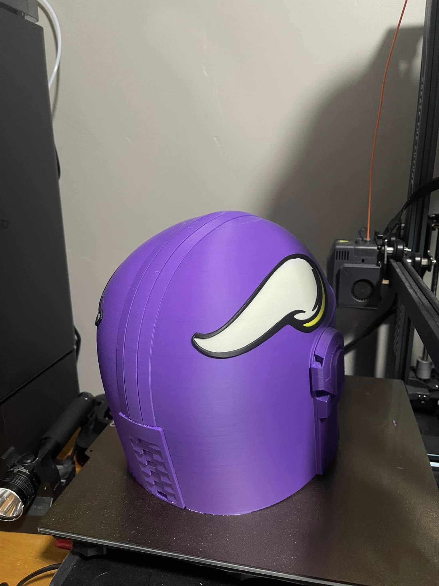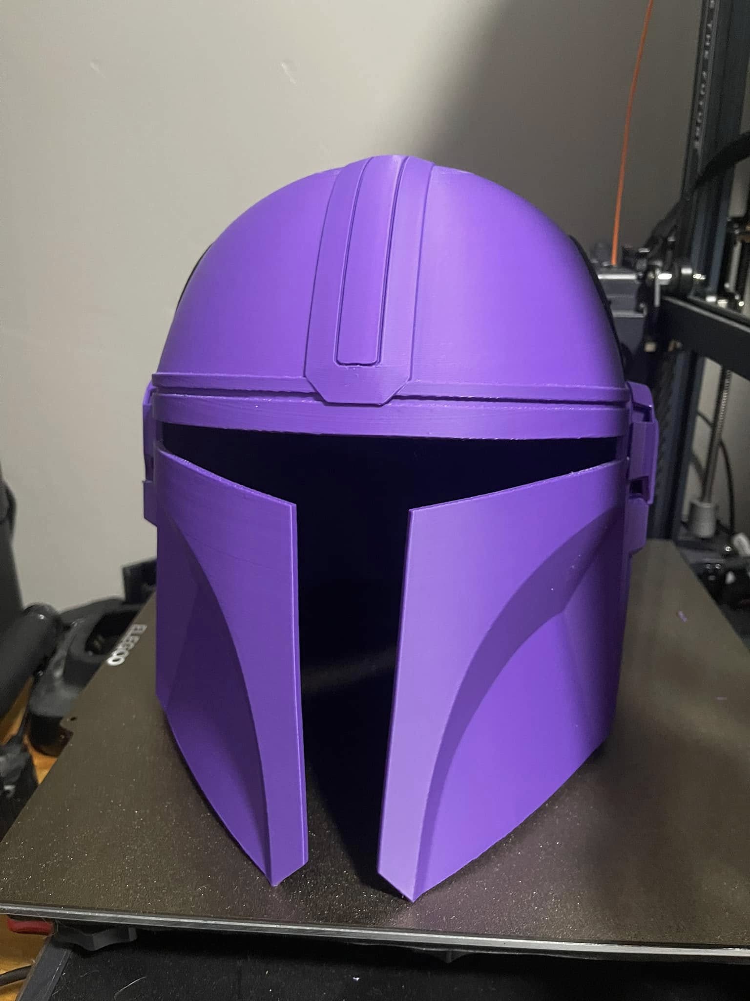 3D printed Mandalorian helmet with horns on both sides. This helmet is sized approximately the same as a medium to large motorcycle helmet. It includes a tinted visor.