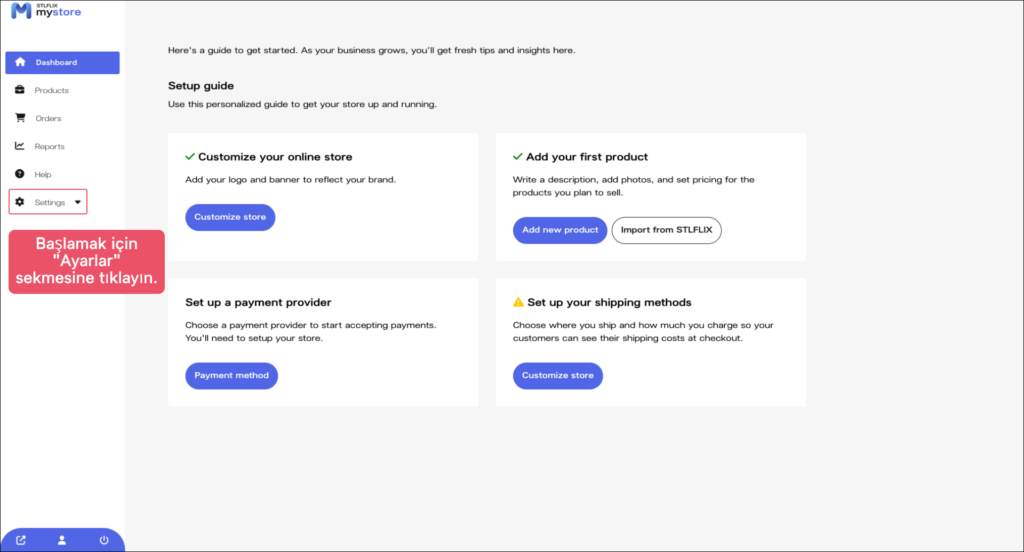 Başlamak için, üst navigasyon menüsünde “Ayarlar” butonuna tıklayın ve açılır menüden “Mağaza”yı seçin. Bu, sizi mağaza ayarları sayfasına yönlendirecek ve burada mağazanızı özelleştirmeye başlayabilirsiniz.
