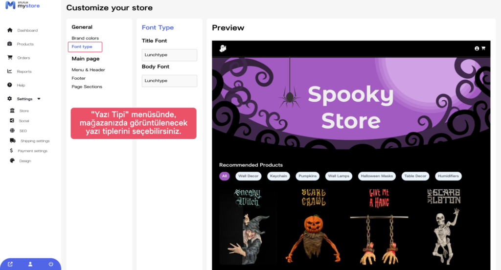 Sonraki adımda, mağazanızın yazı tipi türünü seçin. “Yazı Tipi Türü” sekmesine tıklayın ve çeşitli yazı tipi seçeneklerinden birini seçin. Ayrıca, kendi özel yazı tipinizi de yükleyebilirsiniz.