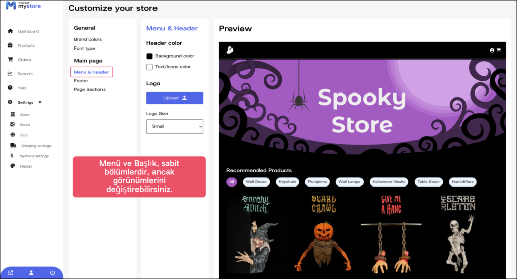 Mağazanızın marka renklerini ve yazı tipi türünü seçtiğinize göre, şimdi mağazanızın menüsünü ve başlığını özelleştirebilirsiniz. “Menü & Başlık” sekmesine tıklayın ve ayarları istediğiniz gibi düzenleyin.