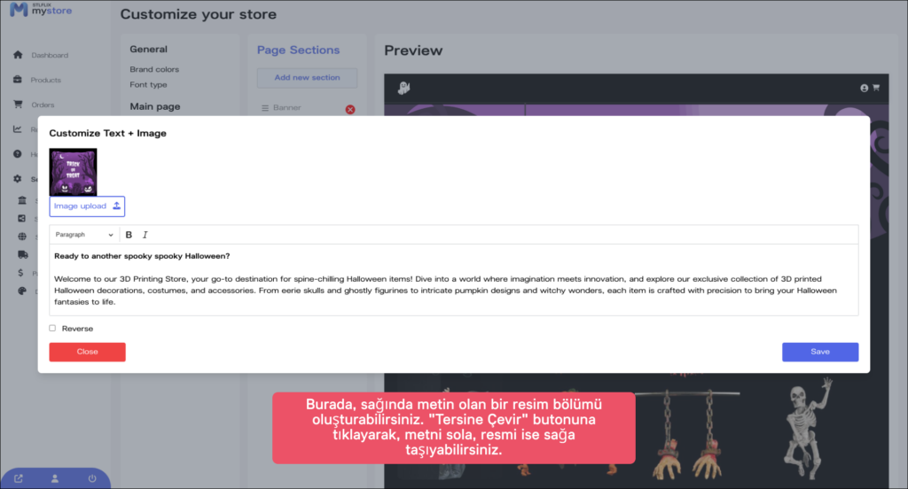 “Sayfa Bölümleri” sekmesinde, mağazanızın metin ve görsel bölümünü özelleştirebilirsiniz. “Metin + Görsel” sekmesine tıklayın ve görüntülemek istediğiniz metinleri ve görselleri ekleyin.