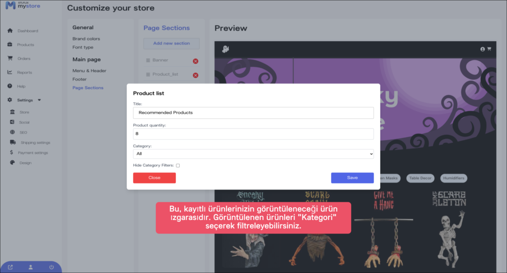 Mağazanızın menüsünü, başlığını ve altbilgisini özelleştirdiğinize göre, şimdi sayfa bölümleri ekleyebilirsiniz. “Sayfa Bölümleri” sekmesine tıklayın ve eklemek istediğiniz bölümleri seçin.